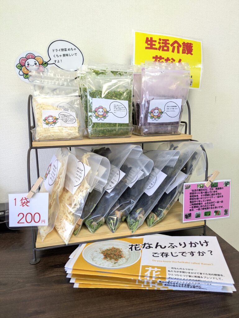 当法人のグループホームに併設する畑で育てた野菜、協力農家から提供していただいた野菜を使いふりかけ作りを行っております。